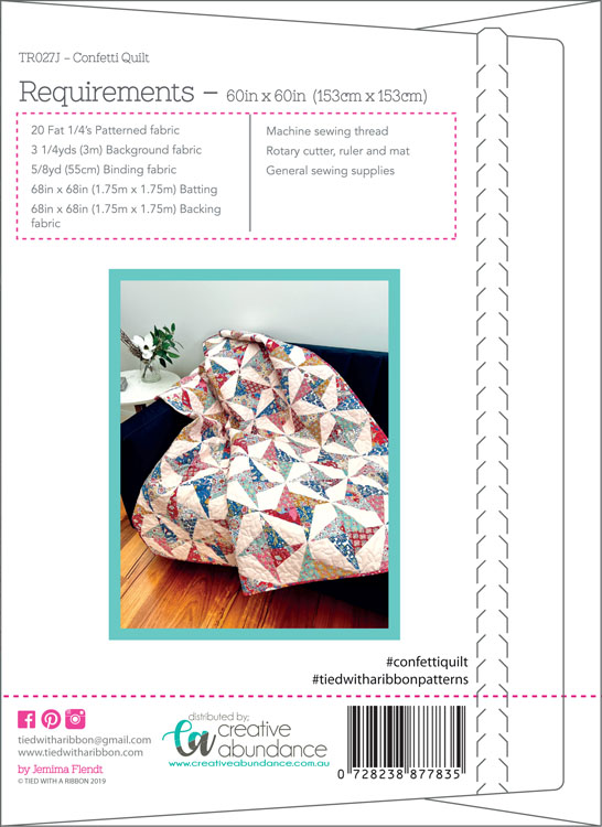 This Confetti Quilt is a visually striking quilt that is perfect to showcase fabric ranges or makes an excellent scrap quilt. It is Fat Quarter friendly. It's modern design allows you to let your fabrics do the talking and is a great quilt unisex quilt for adults or children alike.It is suitable for beginner/intermediate sewers - you will need basic knowledge of rotary cutting and quilting principles. The pattern includes clear instructions to make this quilt and is a great as a lap quilt, for on a couch or bed. Even perfect as a Picnic quilt.